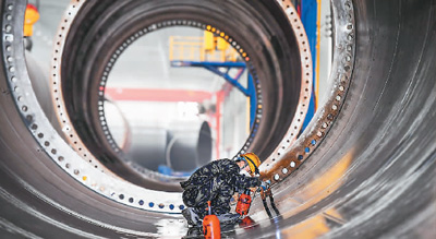 江西省宜春市袁州區積極提供產業、金融等政策指引和專項服務,促進各類中小企業做大做優做強。圖為袁州區錦峰重工科技有限公司的工人在檢測風電塔筒的焊縫質量。