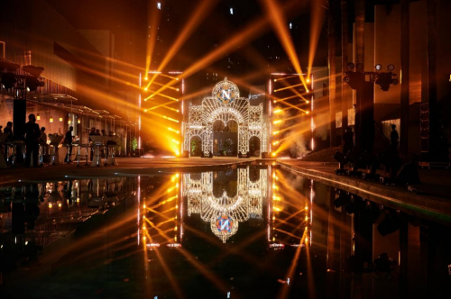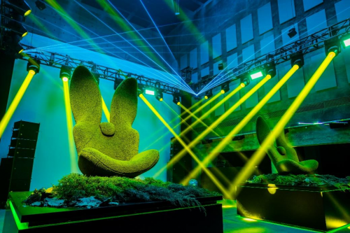 夜幕降臨,活動現場更是異彩紛呈。Luminaria光影秀結合傳統的民間舞蹈塔蘭泰拉,喚起意大利南部熱烈歡快的慶典氛圍。2米高的Germogli裝置錯落有致地分布在入口,輕盈的普利亞特色橄欖樹被金色麥穗環繞。吧臺區域縈繞著動感夢幻的綠色氛圍,“綠兔子”扶手椅擺放其中,帶領賓客一同感受兔子洞的內在活力。