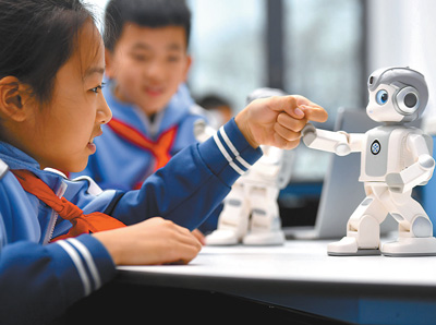 在河北省石家莊市融創中心第一小學,學生與人工智能設備進行互動。