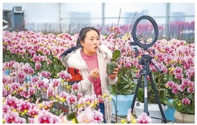 江蘇省宿遷市宿城區王官集鎮蝴蝶蘭大世界目前已建成20萬平方米智能玻璃溫室大棚,每年生產各類種植苗1200余萬株。圖為電商主播在蝴蝶蘭大世界直播銷售蝴蝶蘭。