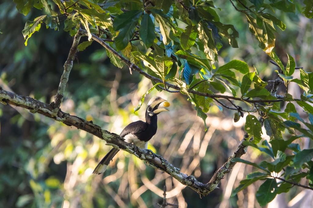 ??2月7日,冠斑犀鳥在盈江縣太平鎮石梯村的山林間吃果子。