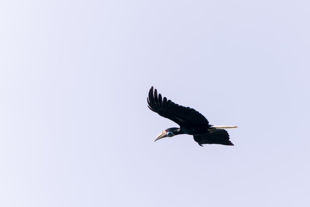 ??2月7日,花冠皺盔犀鳥飛過盈江縣太平鎮石梯村上空。