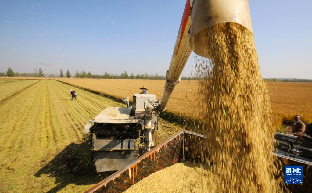 山東省臨沂市郯城縣郯城街道農民將收獲的水稻裝車(2022年10月23日攝)。新華社發(張春雷攝)